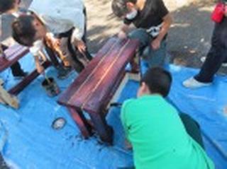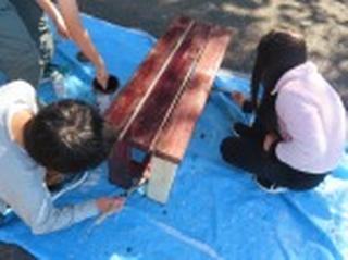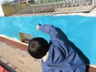 40周年記念事業として飼育小屋再生整備をしている5年生たちは、中に設置する椅子等の防水ペンキを塗っていました。
