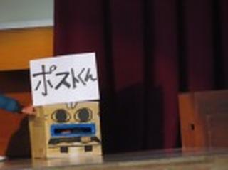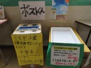 2.5年生のうさぎ小屋の博物館化グループから「展示絵画の募集」。応募箱の愛称は「ポストくん」。愛嬌のある口元。