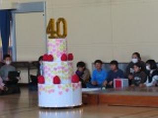 3.運営委員会の呼びかけで完成した「南原小学校40歳の『いちごのバースデイケーキ』」の披露。みんなのお祝いメッセージがいちごクリーム&カスタードクリームのようになっていて…何と!チカチカと灯りも点滅しています。可愛い!