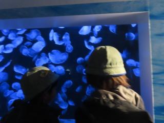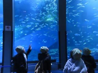 「うわぁ。エイ、おっきい」「ペンギンかわいい!一番ペンギンが好きだなあ!」「あの頭が四角いのが、ハンマーヘットシャークだよ。かっこいい!」…水槽の中を覗き込みながら、スイミーのワールドに浸っている子どもたち。