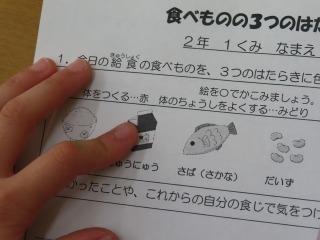 「今日の給食の食べものを3つのはたらきにわけてみましょう」…赤・緑・黄色の色鉛筆を持ち、張り切って色分けしていた子どもたち。「サバは赤!」