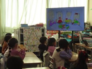 今日は全校で影絵劇を鑑賞しました。体育館に入ると、南原の子どもたちが描いた海の生き物がスクリーンの中で泳いでいました。体育館が暗くなって…みんなで一足早いクリスマス会のような雰囲気。