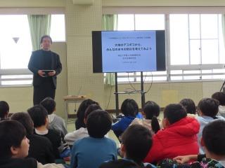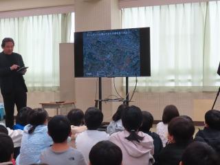 2時間目は、5年生対象に明治大学建築学科田中ゼミ☓高津区役所(「エコシティ高津」事業)による「南原小学校まるごと3D化プロジェクト」の出前授業。タイトルは「大地のデコボコから、みんなのまちの防災を考えてみよう」。