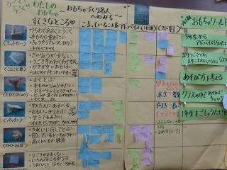 教室の中には、おもちゃやさんを開くまでの道のりが掲示されていました。2年生がうまくおもちゃを動かせなかった時には(去年「おもちゃやさん」で遊ばせてくれた当時の2年生の)3年生のところに相談に行っていたのですね。試行錯誤しながら迎えた今日、放課後、2年生の先生が職員室で「ある子が、『すっごく楽しかった。お金はもらっていないけど、笑顔をたくさんもらった』と感想を言っていたんですよ」と教えてくれました。1年生の先生も「1年生の子たちが、とっても楽しんでいました」と嬉しそうでした。1年生は来年2年生になった時、きっとこの会を思い出すのでしょうね。大成功!
