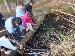 わいわい池をのぞきこんで「うわ、こおりだ!」「本当だ!張っている!」