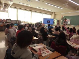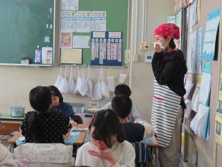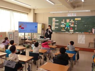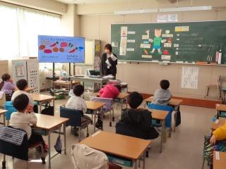 昨日に引き続き、今日も栄養教諭が1年生の教室で「いろいろ食べよう」の食育授業をしていました。