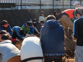 100 年後の高津のまちが、持続可能な循環型都市として、再生と創造していくことを目指す「エコシティたかつ」推進事業。今日はこの事業で推進されている「みどりの里親」に5年生が参加しました。高津区役所の方と外部講師の先生がいらして、南庭に通じる扉前の花壇にノカンゾウを植えました。