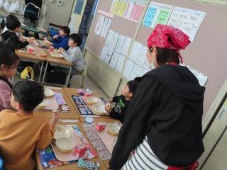 毎日栄養教諭が給食時間に各教室を回っていますが、おせち料理に込められた意味や、昔から伝わるものや料理に込められた思いを知ったばかりの2年生の教室で、「おぞうには、年神様にお供えした餅や山の幸・海の幸などを、『煮雑ぜ(にまぜ)』にして食べたのが始まりですよ」と話していました。