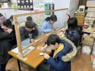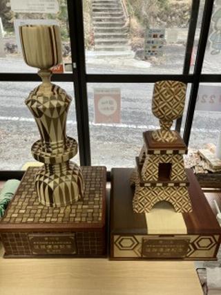 1◆到着。雪がちらつき寒いです。箱根の畑宿は寄木細工発祥の地です。金指ウッドクラフトは箱根駅伝の往路優勝のトロフィーを毎年作っています。ここで寄木体験をしました。