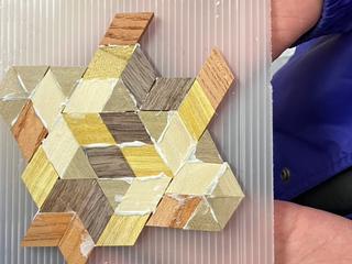 ひし形と三角形合わせて40ピースの様々な色の木を使って、コースターや箸置き、飾りを作りました。全集中で頑張っていました。