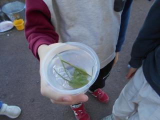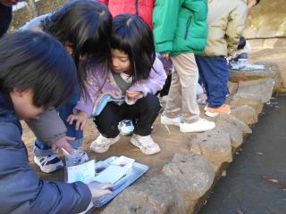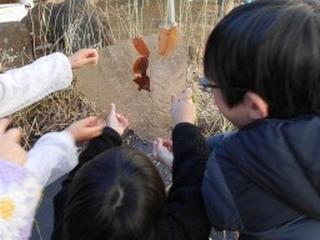1年生たちは「たぶん氷が張っている!」とわくわくしながら登校し、思い思いの場所に置いた自分のシカケを確かめに行きました。[みとおし]