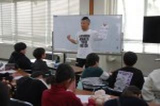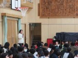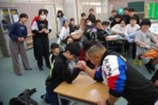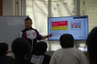 「新日本プロレス所属のレスラーKUSHIDAさん。KUSHIDAさんの幼いころの夢やレスラーになるまで、レスラーになってからのキャリアについて、パネルやスライド、動画を使ってわかりやすくお話していただきました。KUSHIDAさんのフィギュア人形や雑誌の記事に興味津津でした。6年生代表や先生方と腕相撲もあり、楽しく充実した時間になりました。終了後にはサインを求める子もいました。」