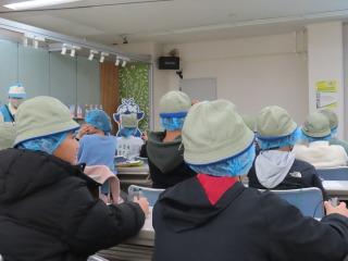 見学前に、「洗剤のしくみ」を知るために「洗剤はどのようなしくみで汚れを落とすのか」のミニ実験をさせていただきました。