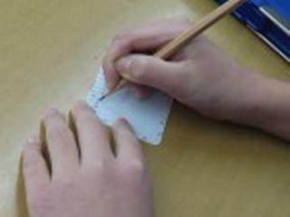 中休みには、1~5年生の子どもたちがたてわり班で集まって、卒業していく6年生にメッセージを書いていました。