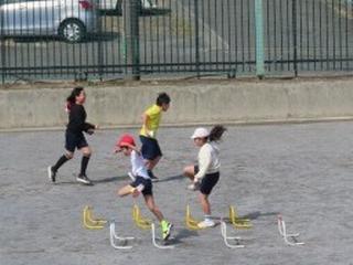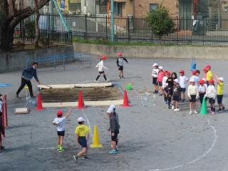 砂場付近では、3年生が「跳ぶ」の運動に取り組んでいました。サーキットみたいに設置されている用具をグループで回っています。