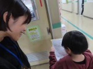 1年生が職員室前で栄養教諭にインタビューしていました。生活科「こんなに大きくなったよ」の学習。