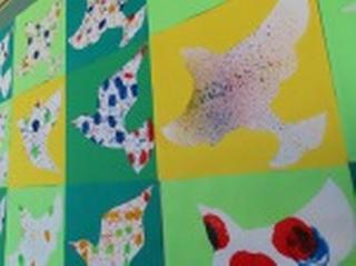 図工室にはアートパーツが並んでいました。4年生がおめでとう飾りを創るために乾かしていたもの。これから切り抜くのだそうです。