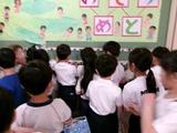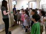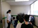 1年生は学校の?をたくさん見つけています。各階の廊下のラインの色の違いについて、教頭先生に質問していました。