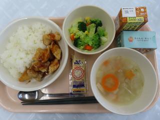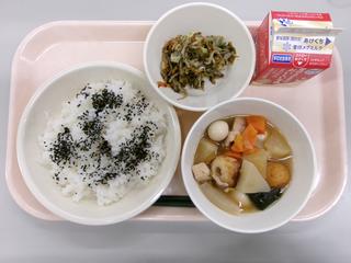 11月25日 ごはん 大根葉のふりかけ とり肉のから揚げ 豆乳中華スープ 牛乳