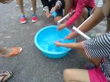 理科「とじこめた空気や水」の学習の延長で、水鉄砲集会をしました。実行委員さんが工夫を凝らした「的あての場」や、走って登場する人を狙う「ヒーロー当ての場」などで楽しみました。水の入れ方や発射のしかたについて、子ども同士アドバイスをしている姿から、学習を活かしている様子が伺えました。これからも、学んだことを活かして、生活を豊かにしてほしいです。