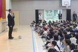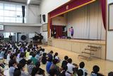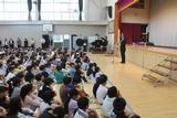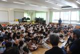 4年生 代表児童の言葉で「自分から進んで取り組んでいこう」と、来月の連合音楽会や、今行っている福祉学習で学んだこと等を発表しました。どの学年も、それぞれの目標に向かって、共に進んでいく大変さやそれ以上の喜びを一つでも多く獲得してほしいと思います。校長先生からは、特に空気を取り入れること意識した動きを教えてもらい、みんなで実践しました。