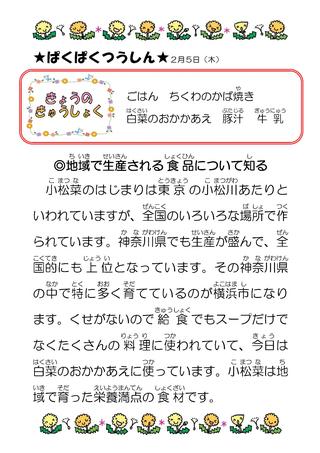 2月5日(木)このところの雨不足で小松菜の発育に影響があるようですね。近所の畑に何が植わっているのか見て歩くものいいかもしれません。今日は入学説明会で来年入学する児童の保護者が集まりました。入学前に給食の様子も見ていただいてワクワクを高めていただきたいです。