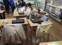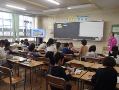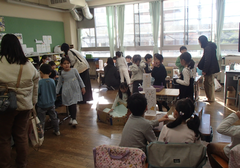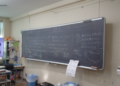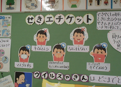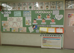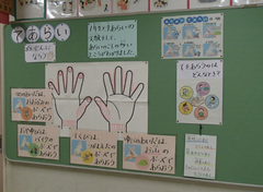 今日は6年生が、中野島中学校に体験入学に行きました。現在、卒業文集にも取り組んでいて、卒業を少しずつ意識する時期になりましたね。アリーナでは、1年生と6年生が中小ステージの練習をしていました。1年生の大きなくじらぐもが素敵でした。5年生はフロンターレ体験学習を校庭で行いました。サポート級はリースづくりをしていました。4年生は保健の学習で、「体の発達」について学んでいました。3年生は社会科で、「田村さんは私たちの見えないところで、どんなことをしているのだろう」という問いで学習していました。保健室の掲示が全面リニューアルしました。話題は手洗いと咳です。今の季節にぴったりですね。今日の給食は「ぶどうまるパン・ミートポテトのチーズ焼き・キャベツのスープ煮・牛乳」です。