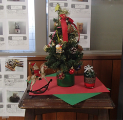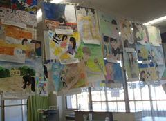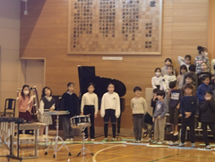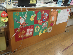 職員玄関には、小さなクリスマスツリーが飾られています。街の色々な所で、同じような飾りを見ることが多くなりましたねr。今日の給食は「ごはん・さばのカレー揚げ・豚汁・白菜のおかか和え・牛乳」です。保健室の掲示がかわりました。この時期、手洗い、うがいが大切ですね。今日は2年生がアリーナで中小ステージの練習をしていました。6年生の多目には、学年のスローガンが貼られています。3年生は英語の授業と書き初め「友だち」の練習をしていました。5年生は自然教室の絵が展示されていました。6年生は12月10日に研究授業があるので、予定のところまで学習を進めていました。1900年代まで学習が進んできました。1965年のオリンピックから問いを作り、学習していました。