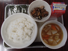 素晴らしい天気の1日でした。しかし、本校の特徴として、東側に校舎があるので、写真のように校庭は午前中、日陰になります。寒さに負けず体育に取り組んでいました。アリーナでは、3年生と5年生が中小ステージの練習をしていました。図書室の飾りがクリスマスバージョンになりました。いつも良い環境を整えていただきありがとうございます。6年生は家族が原爆の被害にあった講師の方から「戦争や原爆の怖さ」や「平和についての願い」について話していただきました。今日の給食は「ごはん・焼き海苔・のっぺい汁・ぶりのつけ揚げ・牛乳」です。