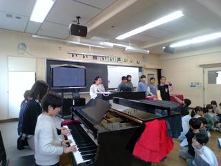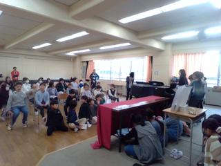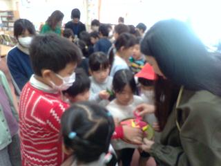 今日は、先週紹介できなかった一コマです。先週19日(金)の中休み、演劇クラブによる発表がありました。場所は音楽室です。あわてんぼうのサンタクロースが主人公のクリスマスのお話です。ペープサート(絵が描かれた紙を割り箸などに貼り付けて、それを操作しながら演じる紙人形劇)で表現していました。1年生から6年生まで、たくさんの子どもたちが見学していました。最後は、お話にまつわる曲「あわてんぼうのサンタクロース」を、見に来た子どもたちも含めて、みんなで歌って盛り上がりました。今週の24日(水)で、冬休み前の教育活動は終了となります。インフルエンザも峠を越え、子どもたちは生き生きと活動しています。