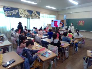 今日は、昨日紹介できなかった一コマです。昨日の中休み、図書ボランティアさんによる「冬のおはなし会」が開催されました。私は別件があり、残念ながら参加できませんでしたが、図書室の様子について報告がありました。今回は、冬にまつわる「エルマーとサンタさん」「It's Christmas,David!」「かさじぞう(紙芝居)」の3作品です。特に紙芝居になると、子どもたちは目を輝かせて、より見えやすい場所ににじり寄って可愛かったです。英語のみの読み聞かせもありましたが、子どもたちは絵をみながら、お話を楽しんでいる様子でした。最後は恒例の図書ボランティアさんからのプレゼント。サンタやツリーなどの折り紙を嬉しそうに選んでいました。図書ボランティアさん、毎回趣向を凝らしたおはなし会、ありがとうございます。