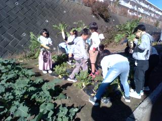 今日の4時間目は、2年生が裏庭に植えた大根を抜きました。確か植えたのは10月頃だったでしょうか。いつもより植えたのは遅かったと思いますが、すくすく育つものですね。抜く前からよく育っている大根は見てわかります。子どもたちは、地域の小嶋さんのご指導のもと、1人1本ずつ大根を抜きました。加減がわからず、なかなか抜けない子もいましたが、やり方がわかると、子どもたちはぐっと力を入れて抜いてみました。誰もが大喜び。何人もの子どもたちが自分の抜いた大根を見せてくれました。そして持ってきた袋に大事そうに入れていました。2年の保護者のみなさん、持ち帰りを楽しみにしてください。小嶋さん、ありがとうございました。