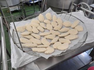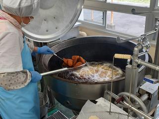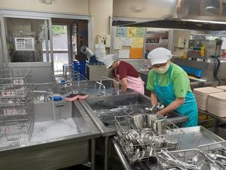 今日私は、給食調理室に潜入しました。もちろん、割烹着・帽子・マスク・長靴着用での潜入です。調理室には冷房がありません。今日はことのほか涼しかったので、室内は28度ほどでしたが、いつもは軽く30度を超えてしまいます。そのため、スポットクーラーを数台持ち込み、熱中症対策をしています。この日はフィッシュサンド用のフライ、こふきいも、ミネストローネを作るため、3つの釜を使っての作業でした。大きなスコップのような道具や大きな網を使って、炒めたり、揚げたりしていきます。途中で調理された物の温度を測って、きちんと揚げたり煮込んだりできているか確認しているのが印象的でした。調理員、補充員がそれぞれ分担して作業しています。午後は、子どもたちが使った食器などを洗浄します。洗浄後は、使った水槽などをピカピカに磨き上げます。毎日毎日同じ作業を丁寧に行っていくことが食の安全につながっています。「モグモグ通信」もお楽しみに。