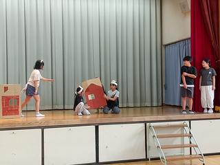 今週は個人面談のため、毎日水曜時程となり、中休みも短いです。そんな中ではありますが、演劇クラブが「三匹の子豚」の劇の発表を行いました。先週から今日にかけての3日間公演です。以前、クラブの時間に、ペンキを塗って、3つの家を作っていたのを思い出しました。オオカミの耳などの小道具も自分たちで作ったそうです。最初の進行から自分たちですすめました。途中、オオカミが煙突から家の中に侵入した時、幕が閉まり、再び開いたときは、子ブタたちが大喜びしていくました。幕がしまったときには何が起きていたのか、想像するのが楽しかったです。次の発表も今から楽しみです。
