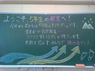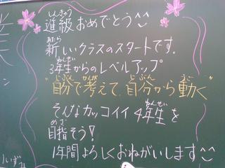 今日から子どもたちは校舎内に入り、新しい学年・学級がスタートしました。西門で子どもたちを迎えましたが、きちんと挨拶ができる子どもたちがたくさんいて、朝から清々しい気分になりました。1年生も挨拶を頑張っていて、地域の方からも褒めていただきました。素晴らしい。教室の黒板に、担任のメッセージが書かれているのを見つけました。私たち教職員も張り切っています。2年生は配られた新しい教科書に自分で名前を書いていました。5年生は学年全員で集まり、学年目標について、確認していました。1年生は、水道場の使い方の確認したりして、学校生活のルールを確認していました。入学式後の初日なので、1年生は早めの下校でしたが、地域の皆様が下校の見守りをしてくれました。ありがたいことです。どの学年も気分も新たに頑張っている様子でした。