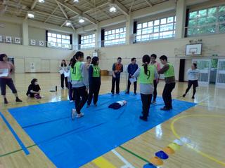 今週は大雨のスタートでした。私は一日出張だったのですが、朝からずぶ濡れになってしまいました。子どもたちもそうだったかもしれません。さて、放課後、来たる水泳学習の前に、教職員で2つの研修を行いました。第1部は体育館で、心肺蘇生法RPG研修です。この研修は西菅小ならではかもしれません。実際に子どもたちに不測な事態が起きた時を想定して、適切に行動できるのかを考えてみます。教師役、児童役、保護者役などに分かれて動いてみると、慌ててしまってスムーズな指示が出せなかったり、動線がよくなかったりする部分がわかりました。第2部は実際に水泳学習を行う多摩スポーツセンターに移動して、ダミー人形を使って講師の方から心肺蘇生法を教えていただきました。先週の避難訓練に続き、備えあれば憂いなしです。