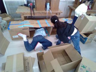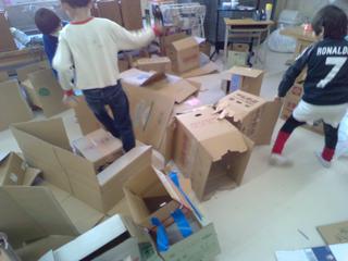 段ボールの中に入って思いついたことから活動する造形遊びの学習をしました。段ボールをかぶったり、つなげて長いトンネルや家を作ったりするなど、思い思いに楽しいんでいる姿が見られました。友達と関わりながら活動を工夫することができました。