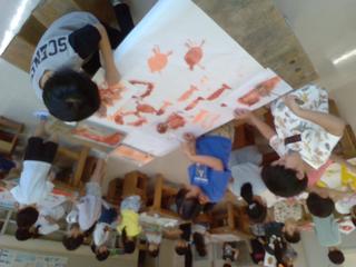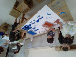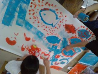 図工「たのしくうつして」では、型紙と絵の具を使って大きな紙にいろいろな形をたくさん写しました。魚をたくさん並べて水中の様子を表現したり、同じ形を色を変えて並べて楽しんだりしていました。今日はグループで大きな紙を使いましたが、来週からは一人一枚の作品を作っていきます。お楽しみに!