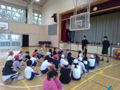 11月11日(火)プロバスケットボールチーム「川崎ブレイブサンダース」のコーチの方々をお招きし、バスケットボール教室を行いました。コーチから「仲間と協力し、挑戦することを大切にしてほしい」とお話があり、子どもたちは真剣に聞いていました。