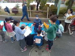 今日は多摩消防署、菅出張所の消防士の方に来ていただきました。実際に消防車を見たり、積まれている道具や身に付ける衣服に触れさせてもらったりと多くの体験活動をさせていただきました。