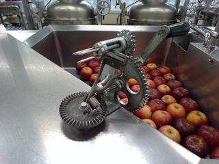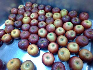 10月10日のりんごです。品種は「あきばえ(秋映)」というものです。「秋映」は、「せんしゅう(千秋)」と「つがる」という品種をかけ合わせて生まれた長野県のりんごです。9月下旬から10月下旬にかけて旬を迎えます。暗赤色の濃い果皮と、甘みと酸味のバランスがとれた濃厚な味と、パリッとした硬めの食感が特徴で、ちょっと高級なりんごです。皮をむかないでも食べられますが、給食では写真の器具で皮をむいて出します。