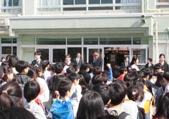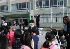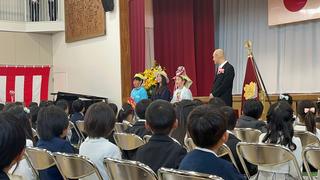入学おめでとうございます!131名の元気な子どもたちを「Wさん」と「さくらさん」と「すげおさん」と寸劇?(朝リハーサル1回)で大歓迎!