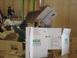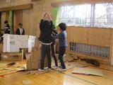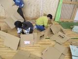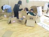 4年生が学年みんなで段ボールを使って体育館で造形活動をしていました。作りながら相談してアイデアを出し合いながら活動していました。