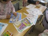 1年生は図工で「せんのぼうけん」に取り組んでいました。偶然できた線の模様を様々なものに見立てて色を塗っていきます。発想の豊かさに驚きます。