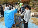 5月から大切に育てた稲を刈り、明治時代に開発をされた足踏み式の脱穀機を使って籾のみを刈り取りました。力づよく足で踏むことで中の刃が回転をする仕組みとなっています。踏むタイミングが悪かったり、強さが弱かったりするとうまく回転しないため、子どもたちは何度も確認をしながら行っていました。きれいに刈り取られる様子を見て「おー!」と歓声が上がりとても感動している様子でした。さあ次回はいよいよ家庭科の学習につなげ、お米を炊く調理実習を行います。