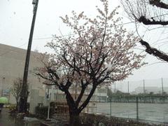 満開の玉縄桜にも、咲き始めた1年生のチューリップにも雪が・・・。
