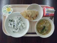 献立は ミニわかめごはん サンマーメン ジャンボあげぎょうざ 湘南ゴールドゼリー 牛乳 です。
