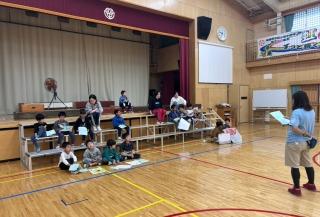 作ったかるたを合わせて、全校でジャンボかるた大会をして遊びました。