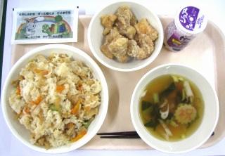 お祝いまぜご飯、からあげ、お祝いなるといりすまし汁、スローガンがプリントされた焼き海苔