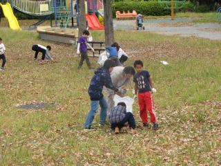 1年生と6年生はペアになり協力して落ち葉を拾っていました。